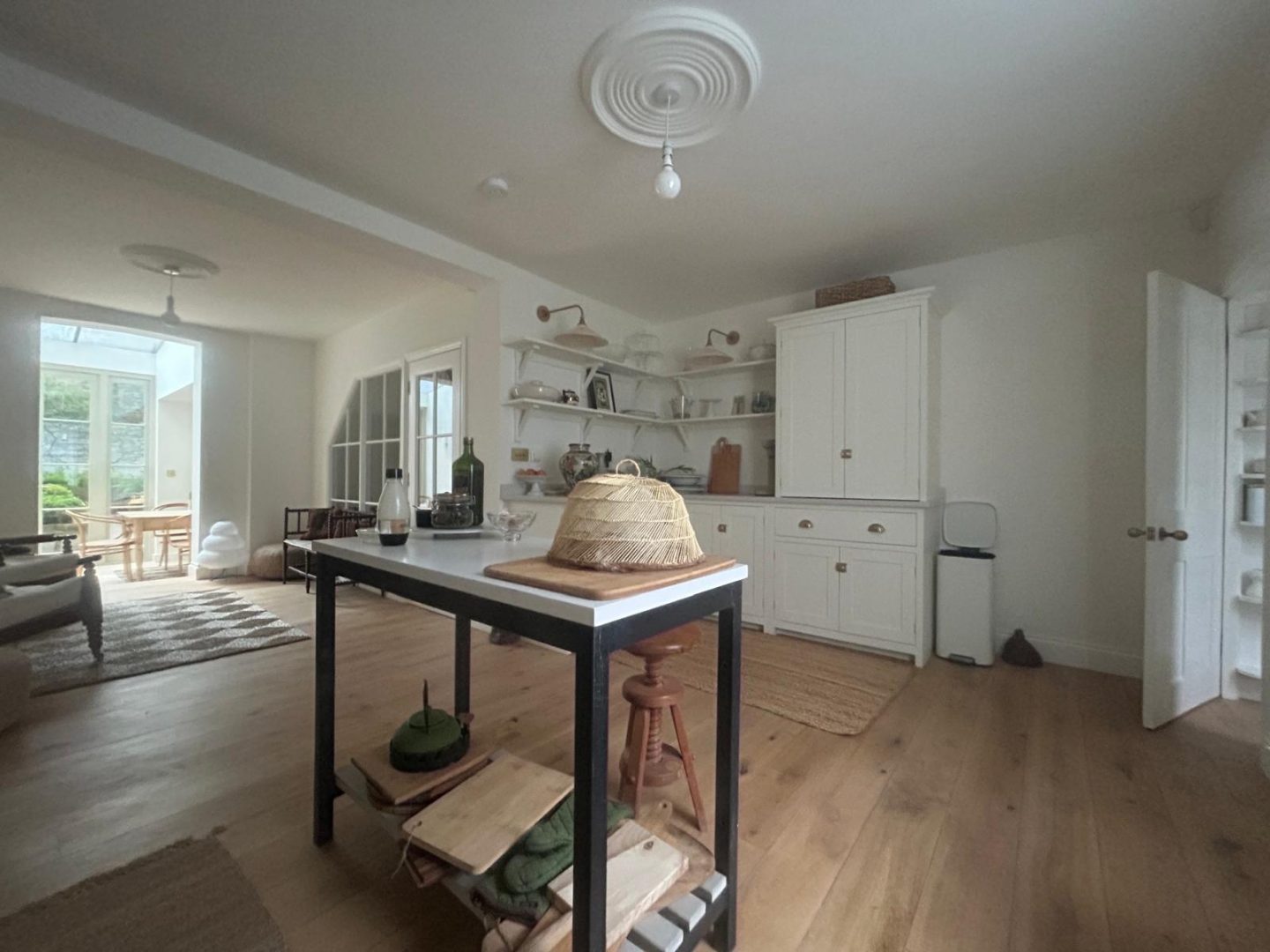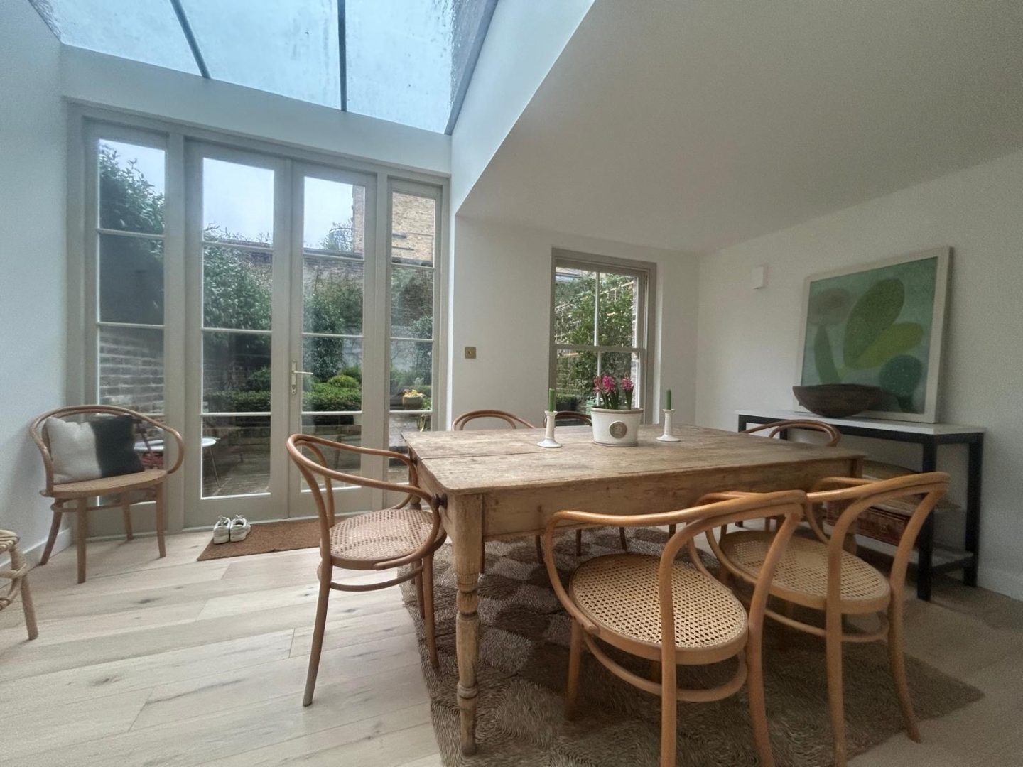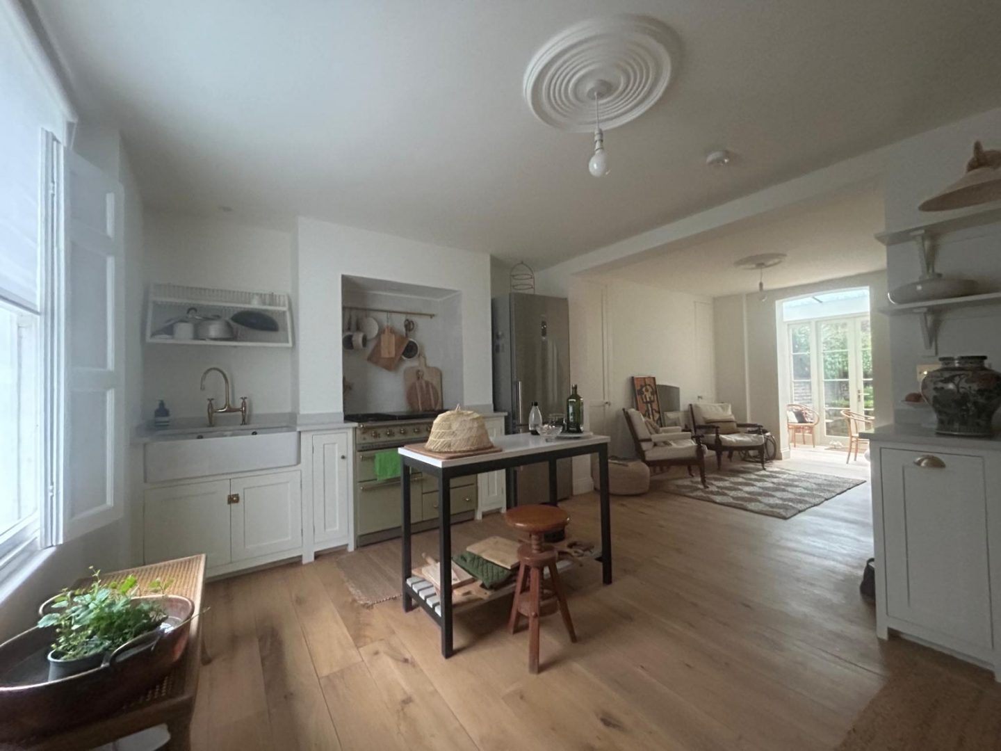 An elegant ground floor extension showcasing a striking glass roof and sophisticated French doors that open up the space with natural light. Rich, traditional oak flooring adds depth and texture, while the timeless kitchen design blends classic craftsmanship with high-end finishes. The result is a beautifully curated interior that exudes refined charm.